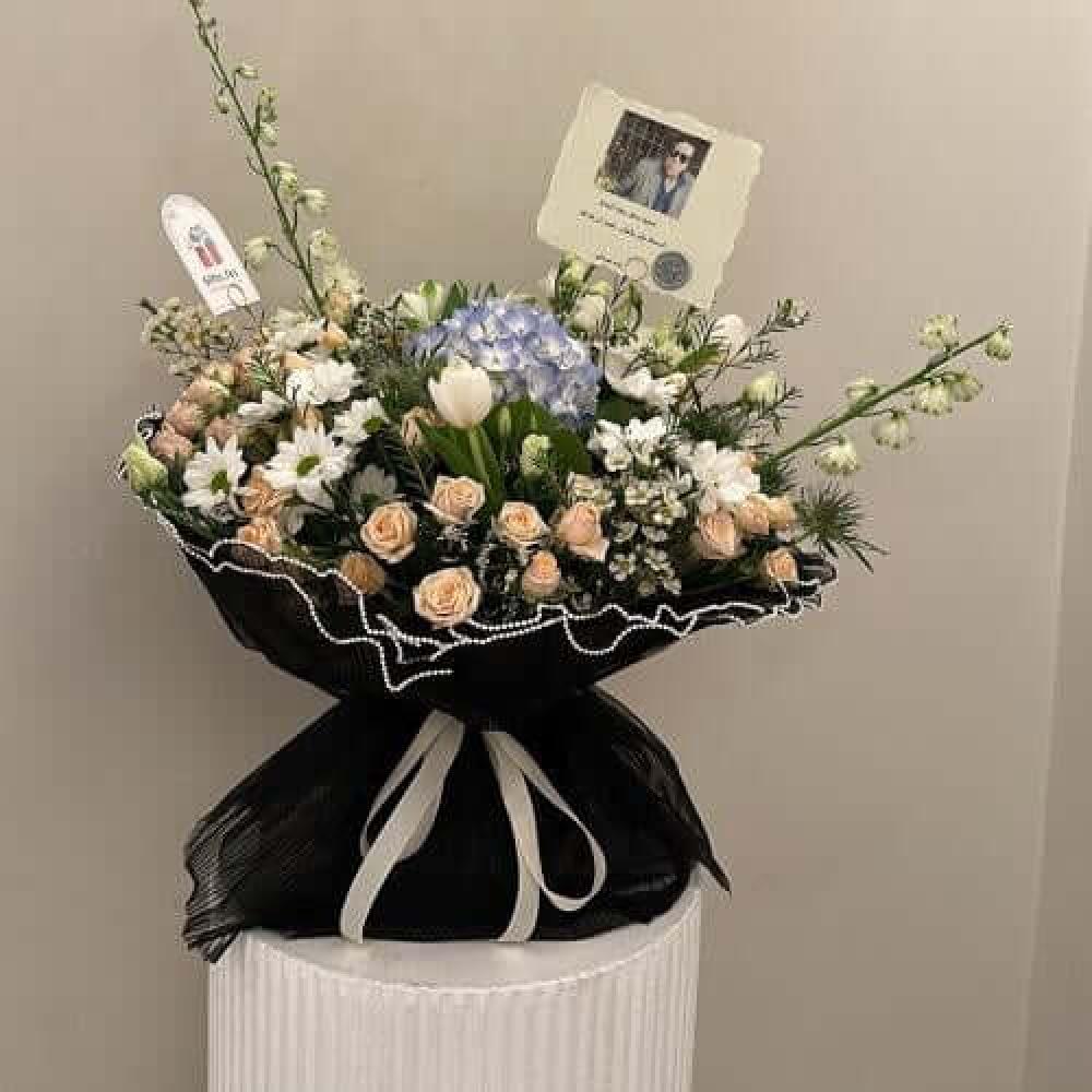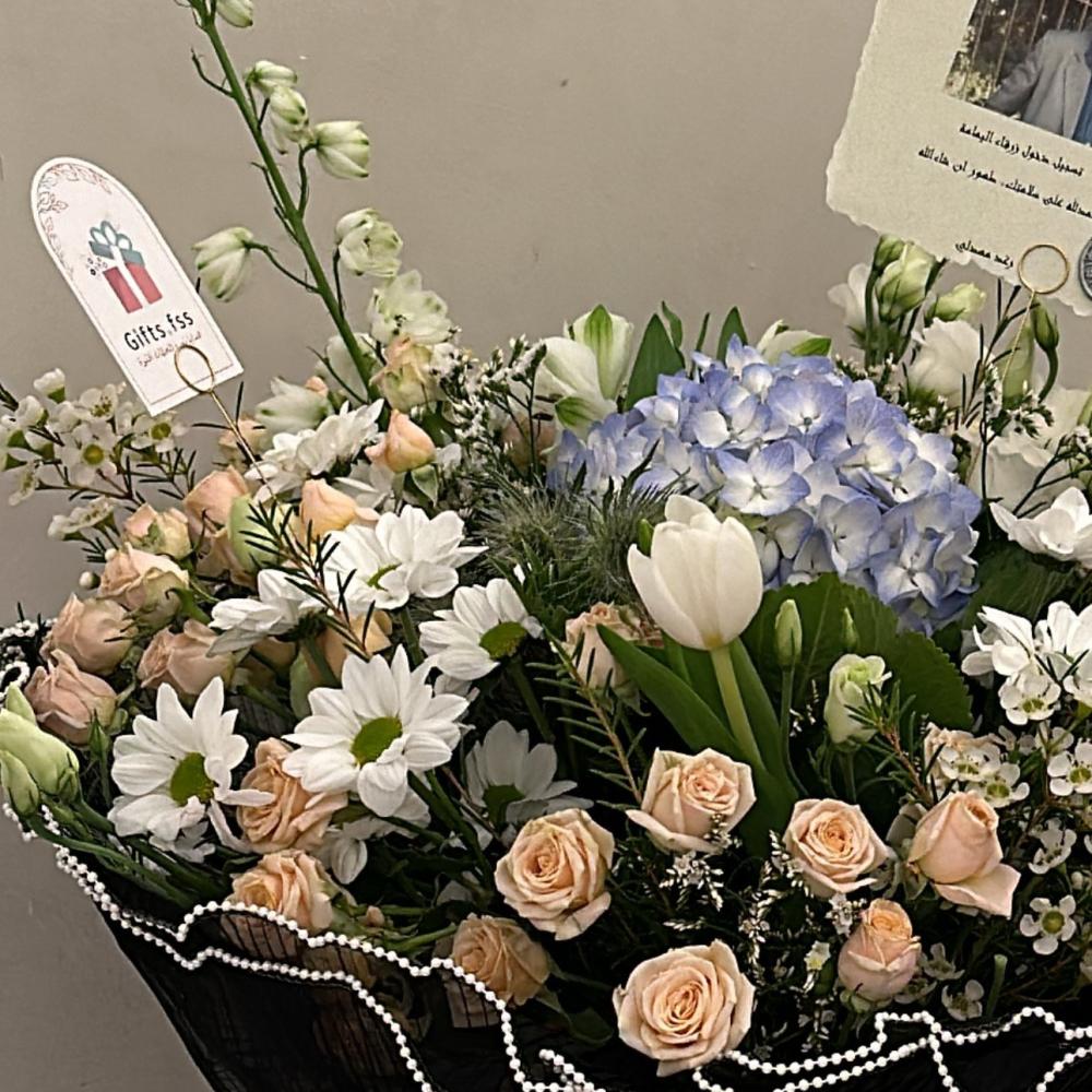 باقة زهور أنيقة تضم ورود هيدرنجا زرقاء، مع توليفة من الزهور البيضاء والوردية. مثالية للإهداء في المناسبات الخاصة بتغليف فاخر ولمسات رقيقة.