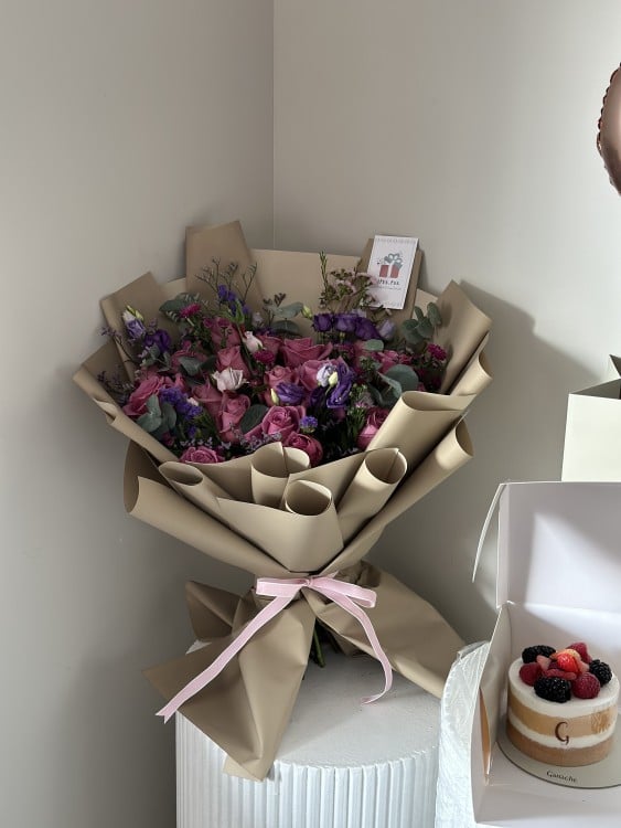 تنسيق عيد ميلاد مميز مع باقة زهور أنيقة وكيك جاناش التوت، هدية مثالية للاحتفال بعام جديد مليء بالفرح والذكريات الجميلة.