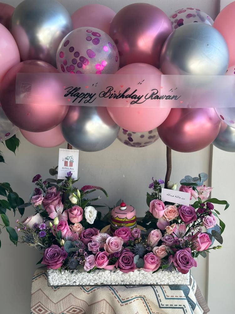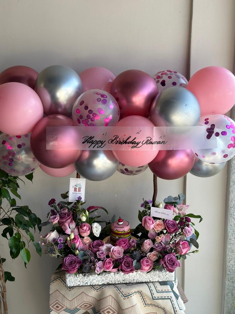 تنسيق احتفالي فريد لعيد الميلاد مع بالونات وردية وزهور طبيعية تضفي جواً مميزاً ومبهجاً. مثالي للاحتفال بأعياد الميلاد بأسلوب أنيق وجذاب.