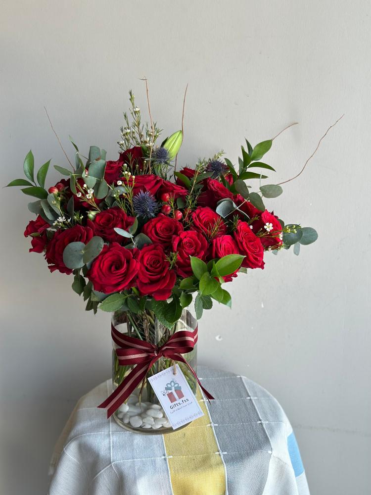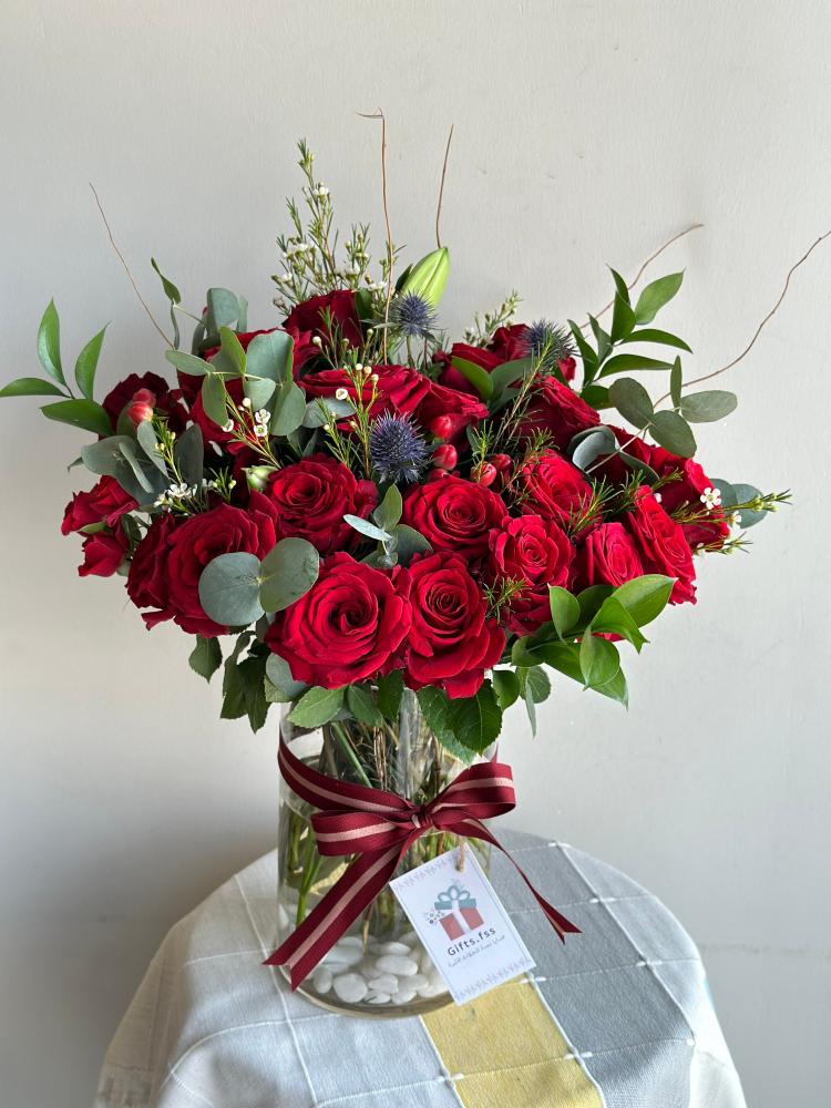 اجعل اللحظات الخاصة تتألق مع باقة الورود الحمراء الكلاسيكية، مرتبة بعناية في مزهرية زجاجية أنيقة، مثالية للتعبير عن الحب والشغف في كل مناسبة.