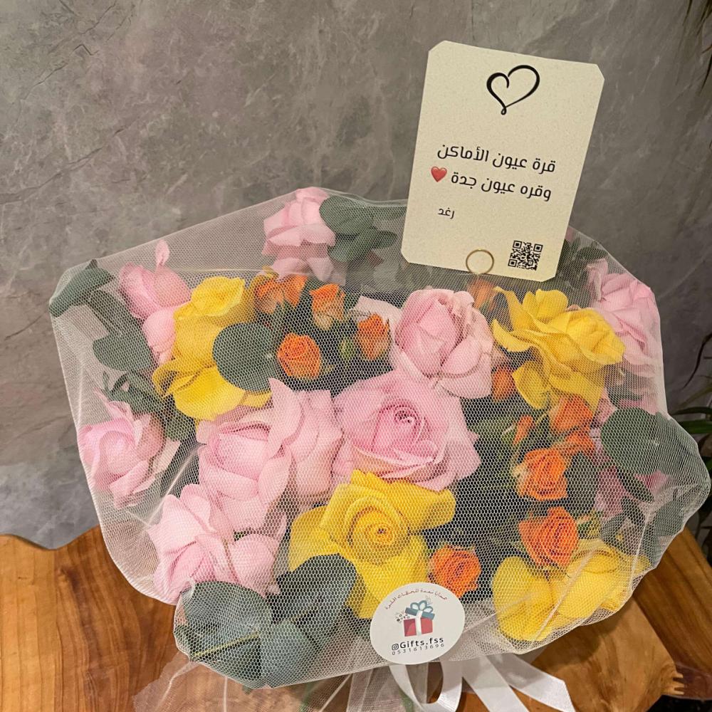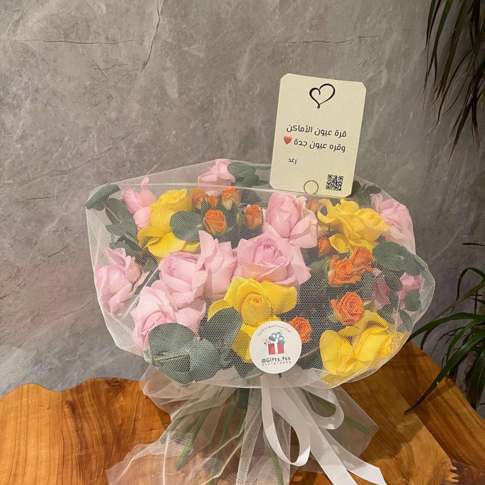 باقة ورد مبهجة بألوان وردية وصفراء وبرتقالية تعبّر عن الود والامتنان، مثالية للإهداء في المناسبات السعيدة ولرسم الابتسامة