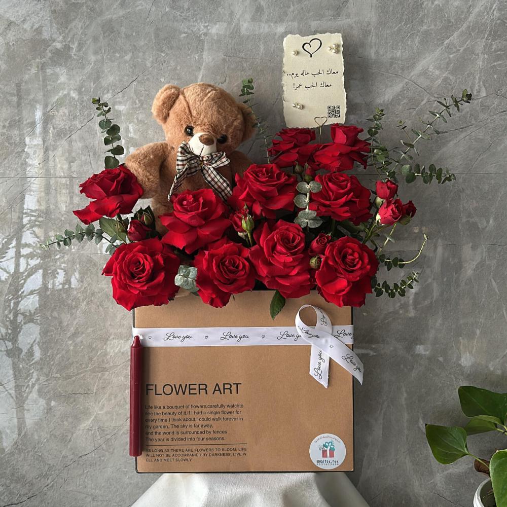 تنسيق زهور ساحر مزود بدبدوب لطيف وبالون قلب أحمر، هدية رومانسية تضيف لمسة من الحب والدفء لأي مناسبة خاصة.