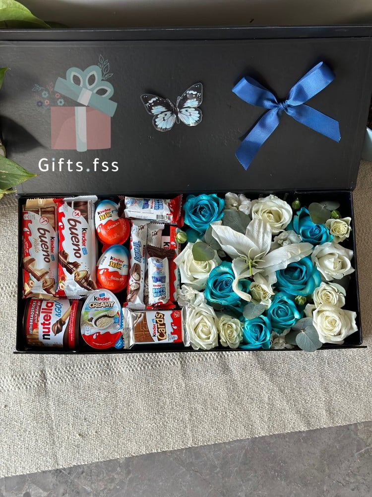صندوق هدايا مع شوكولاتة كيندر وزهور زرقاء وبيضاء