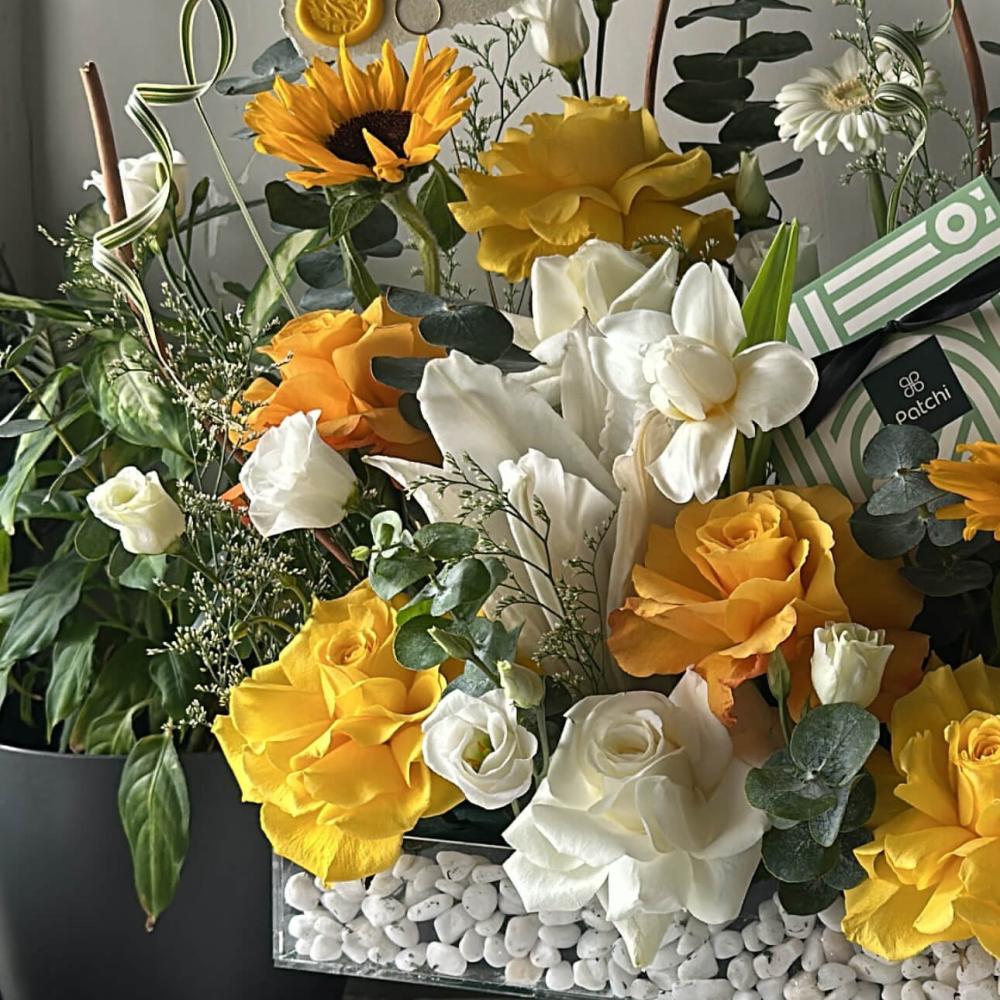تنسيق ورد يفتح النفس بألوان رايقة ومعاه ربع كيلو شوكولاتة باتشي. أحلى هدية للمناسبات اللي تبغى تترك فيها أثر حلو