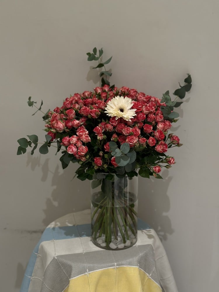مزهرية زجاجية أنيقة تحتوي على باقة ورود وردية مع لمسة من أزهار الجربيرا البيضاء، هدية مثالية لتزيين المنزل أو المكتب بجمال الطبيعة.