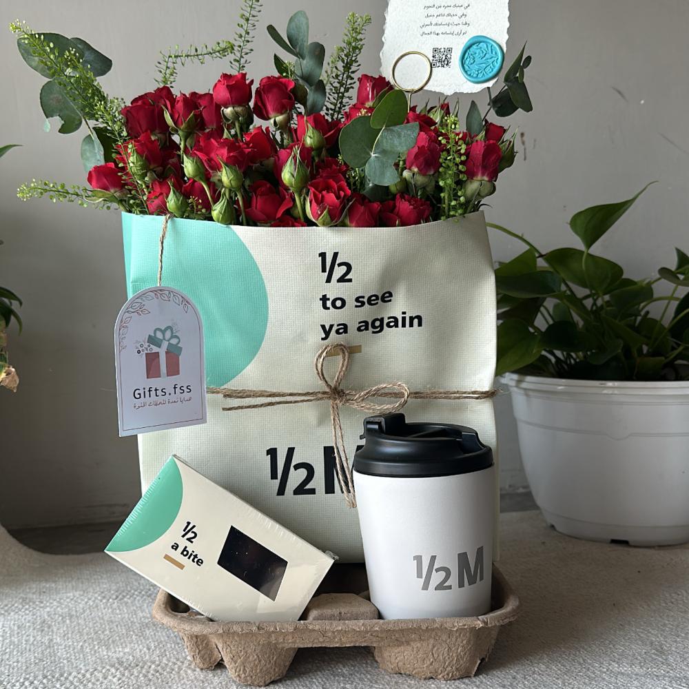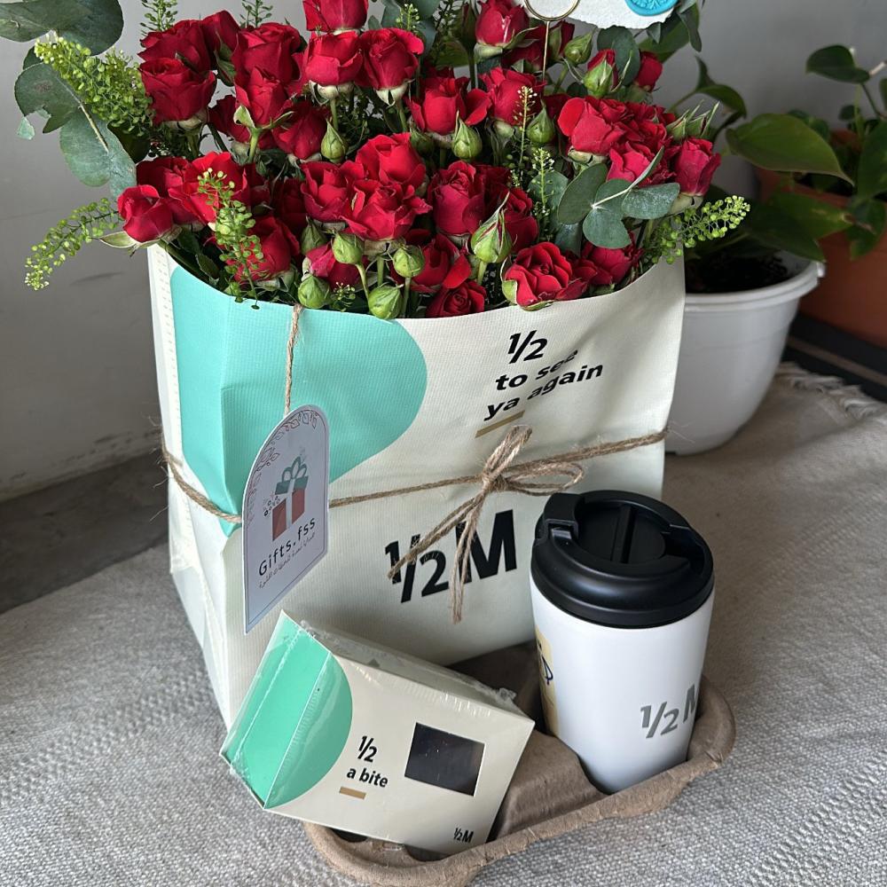 اجعل مناسبتك مميزة مع قهوة هاف مليون، شوكولاتة براونيز لذيذة، وباقة من الورود الحمراء الأنيقة، هدية متكاملة لعشاق القهوة والرومانسية