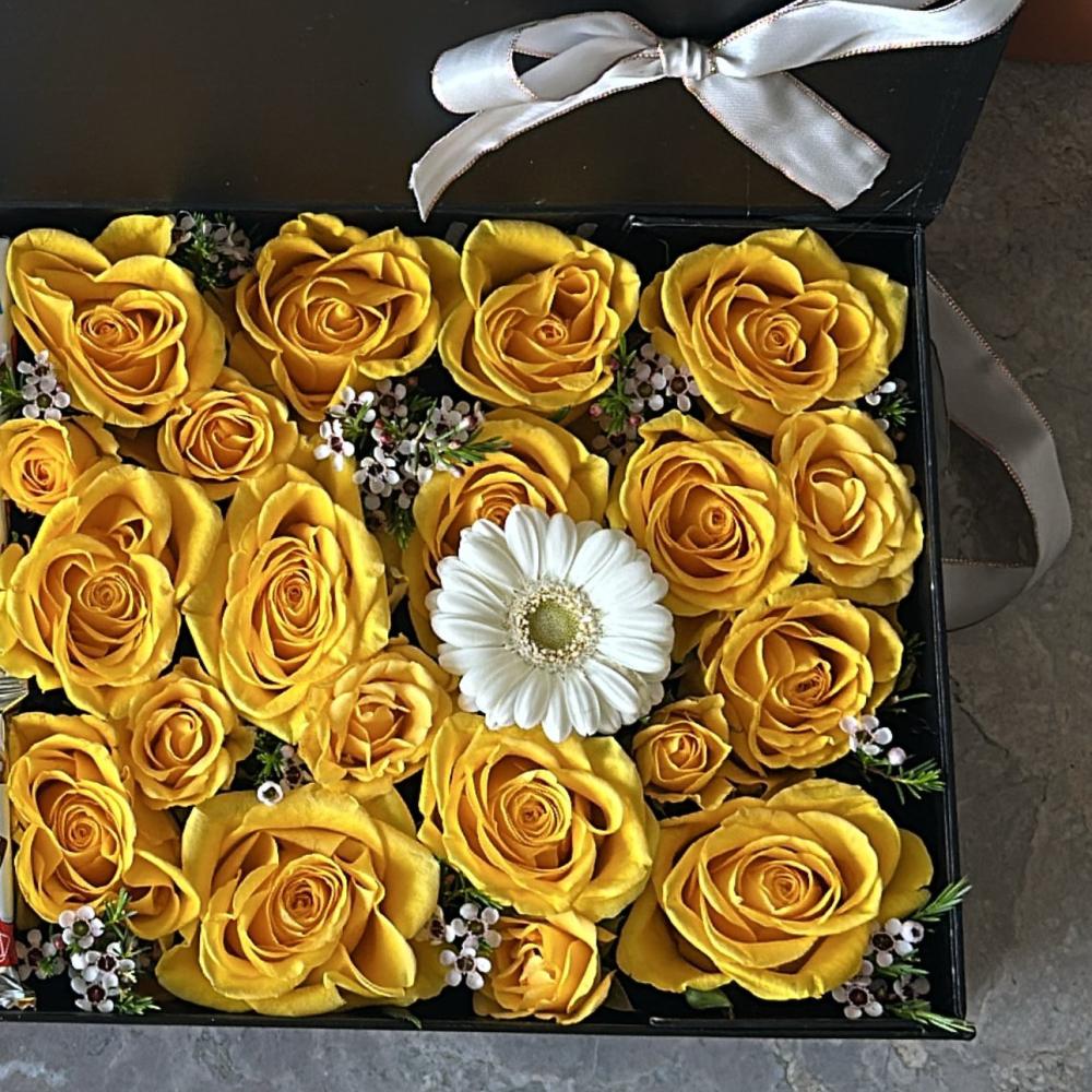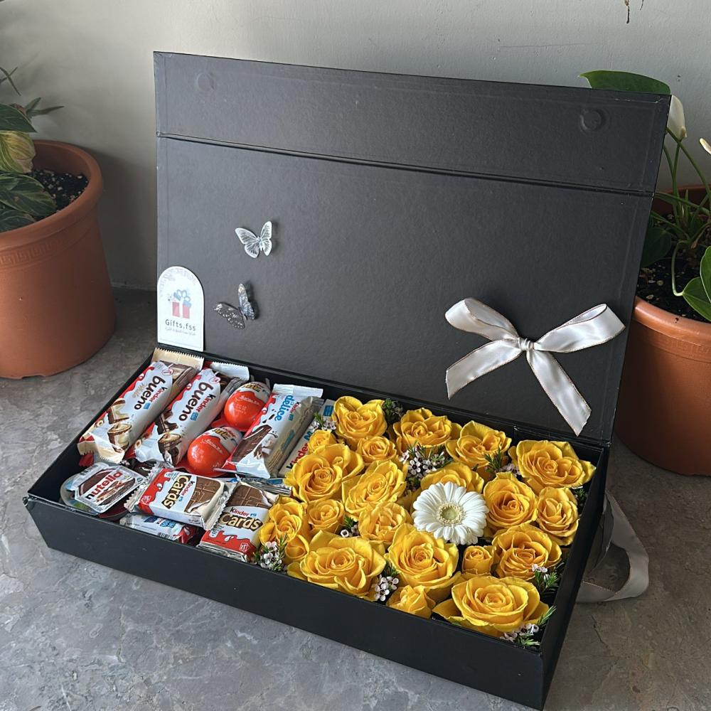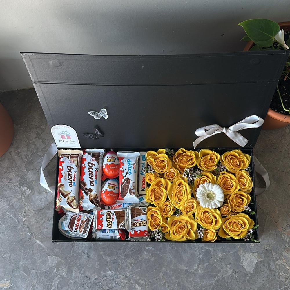 صندوق هدايا فاخر يحتوي على شوكولاتة كيندر مع تنسيق ورد أصفر مميز. هدية مثالية للمناسبات السعيدة والاحتفالات الخاصة