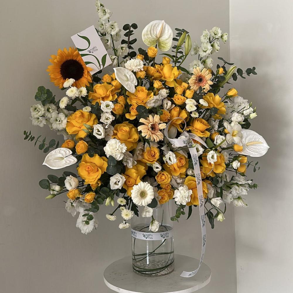 فازة ورد طبيعي لون اصفر أضف لمسة شخصية مع تنسيق زهور فاخر في مزهرية . يمكنك تخصيص الهدية بإضافة الاسم الذي تريده