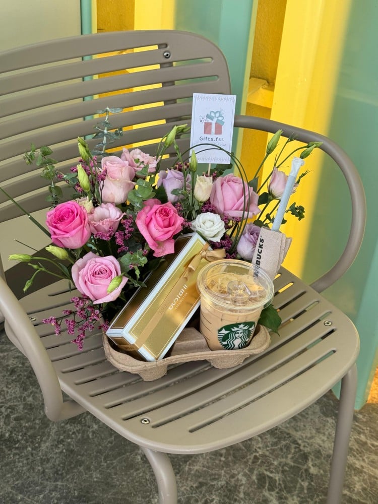تنسيق ورد وردي أنيق مع شوكولاتة فاخرة ومشروب ستاربكس، هدية مميزة تجمع بين الجمال والمذاق الفاخر، مثالية للمناسبات الخاصة.
