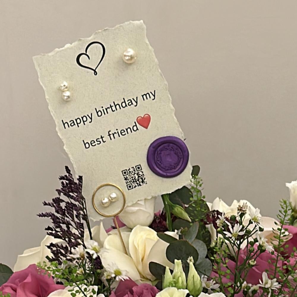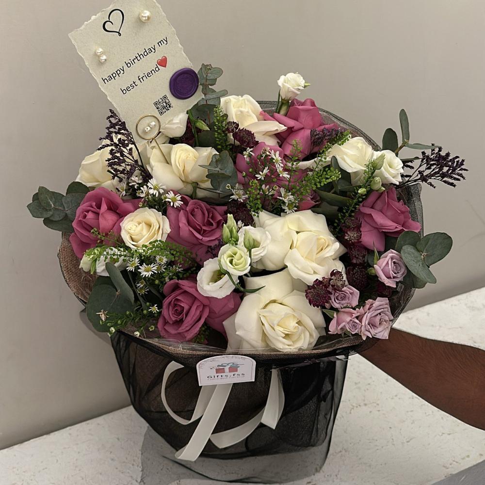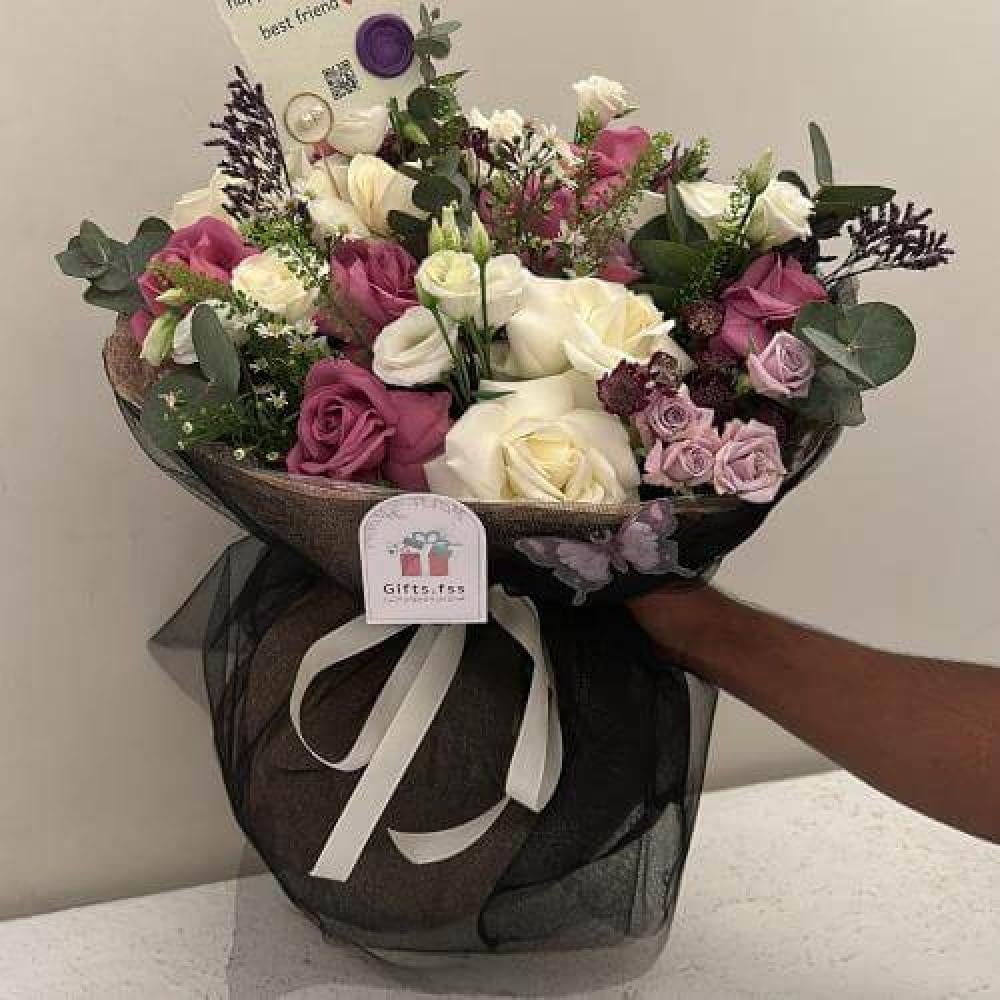 بوكية مميز يجمع بين الورود البيضاء والبنفسجية مع فراشة صناعية أنيقة، هدية مثالية للمناسبات الخاصة تضيف لمسة من الجمال والتميز