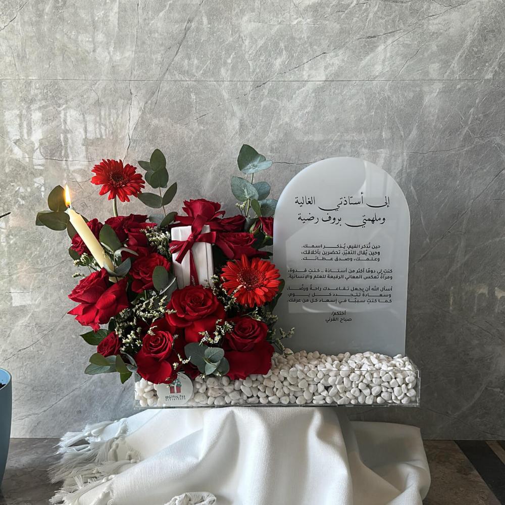 هدية شكر راقية تتضمن عطر كارتير من مجموعة لابنثر ولوح أكريليك بنص مخصص وتنسيق ورد فخم، مثالية للأستاذة أو شخص عزيز
