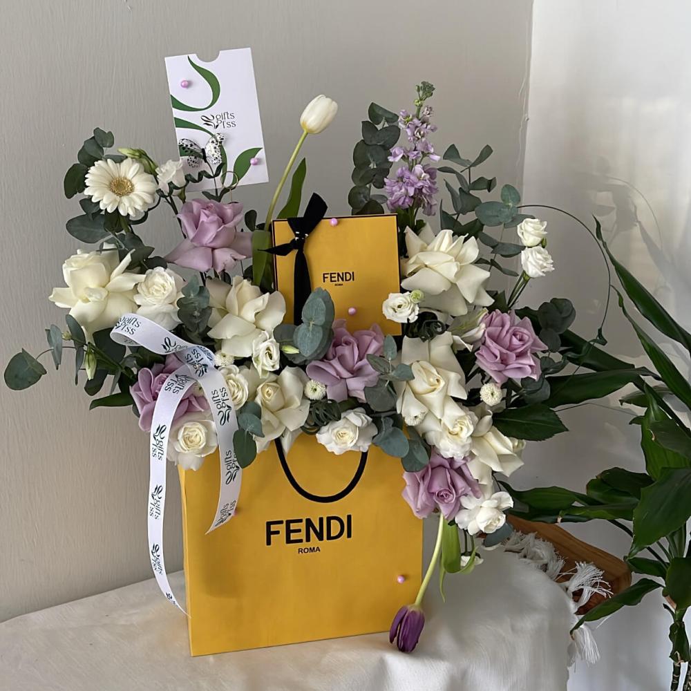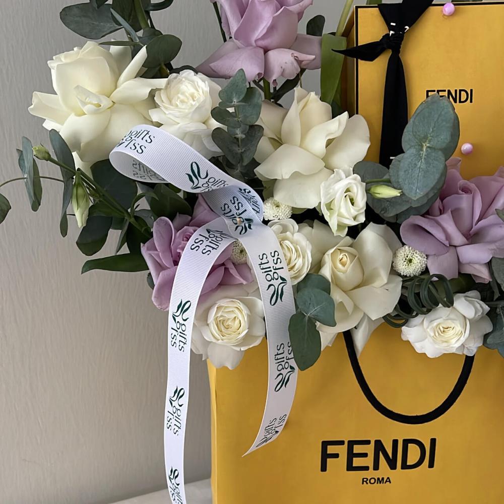 تنسيق زهور بيضاء أنيق مع إسورة فندي الفاخرة، هدية تجمع بين الأناقة والفخامة، مثالية للمناسبات الخاصة.