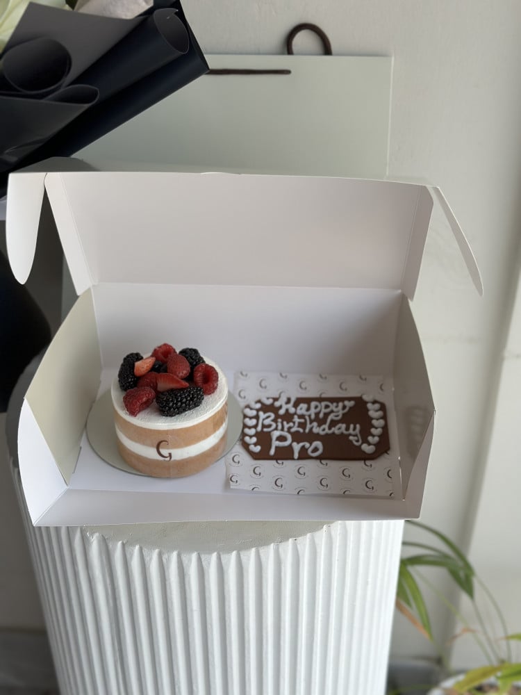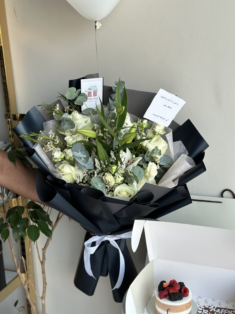 باقة زهور بيضاء أنيقة مع كيك جاناش التوت اللذيذ، هدية مميزة تجمع بين الجمال والمذاق الرائع للمناسبات الخاصة.