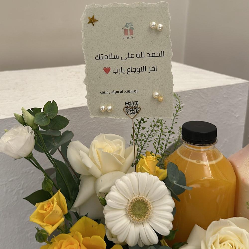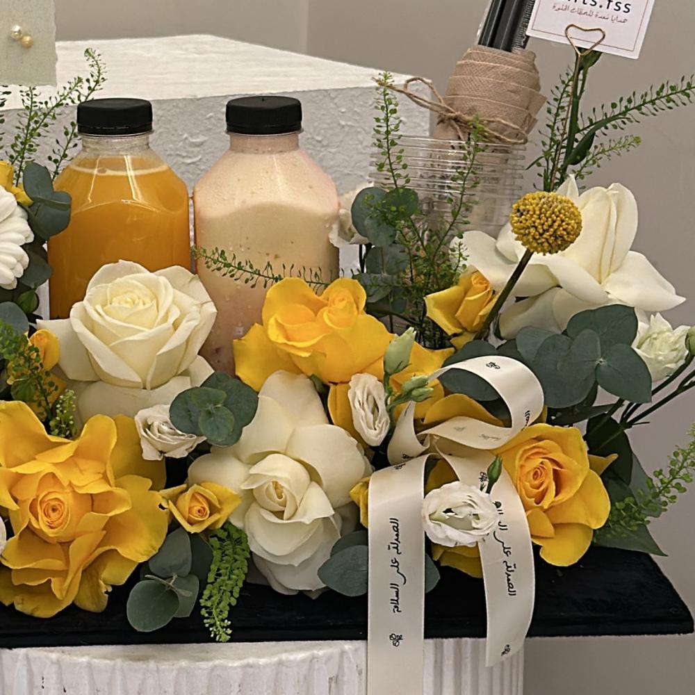 تنسيق ورد أصفر أنيق مع عصائر Signature، مثالي لمناسبة التهنئة بالسلامة مع لمسة خاصة من الأناقة والاهتمام.