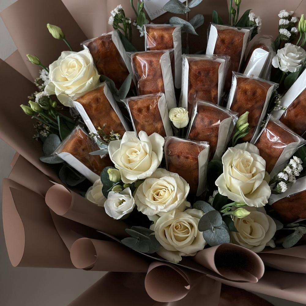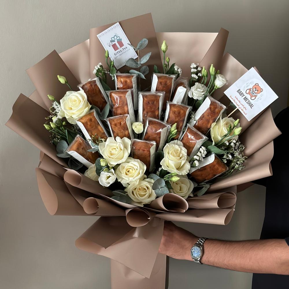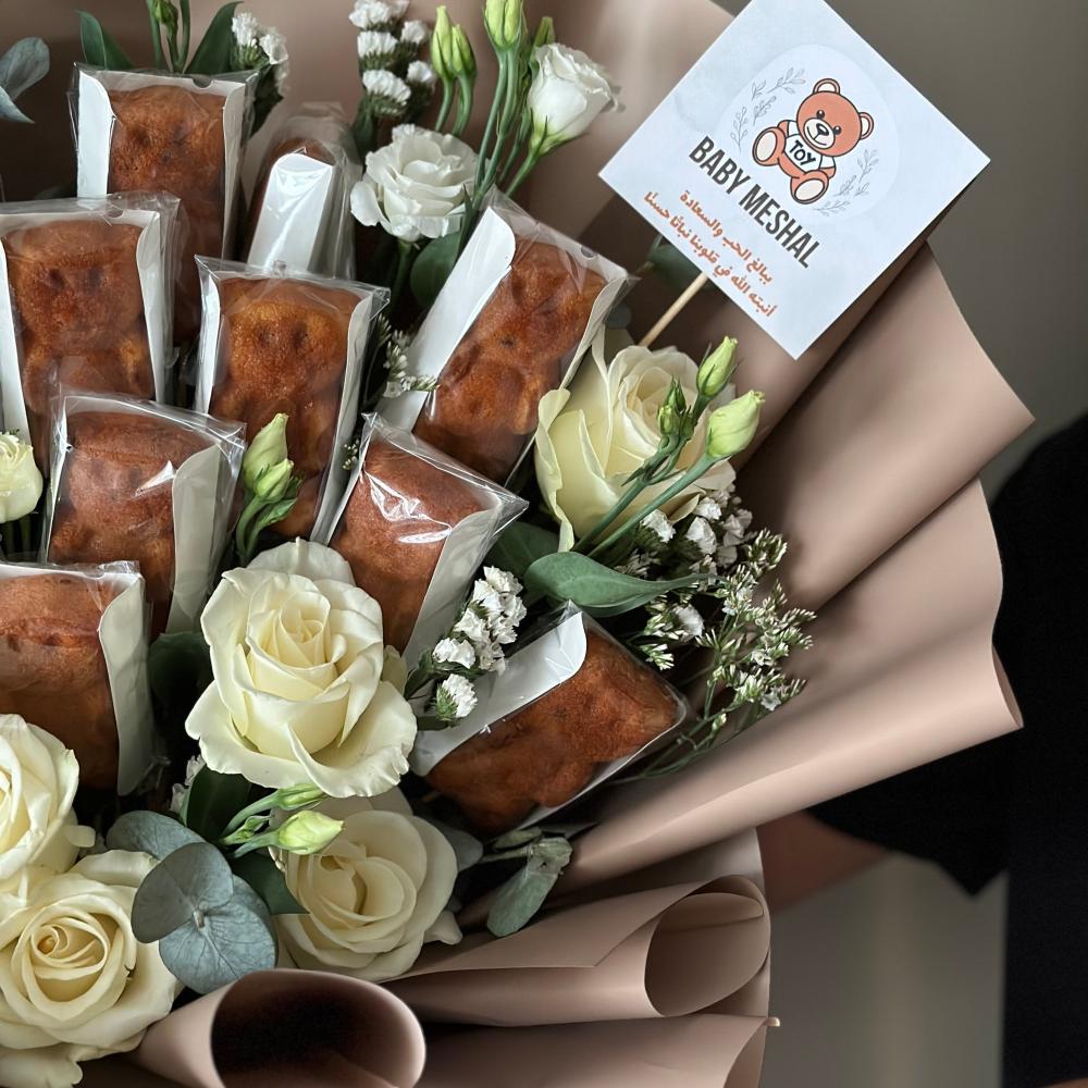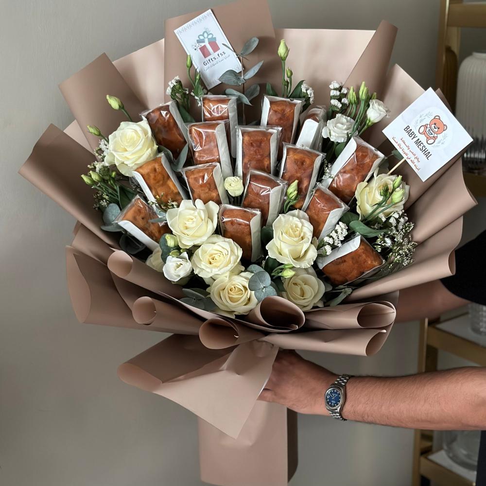 باقة ورد فاخرة مع كيك على شكل دبدوب. هدية تجمع بين جمال الزهور وحلاوة الكيك المميز، مثالية لإضفاء لمسة من الفرح على أي مناسبة