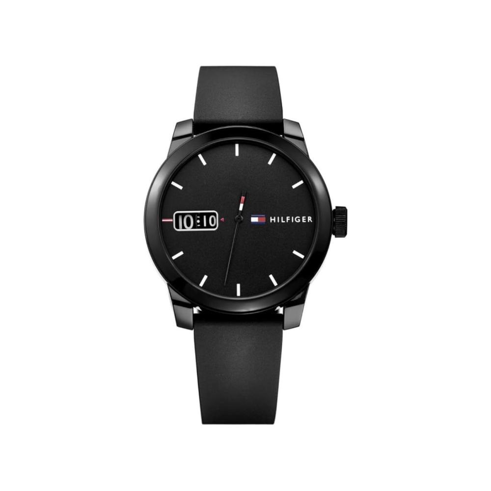 ساعة تومي هيلفيغر الرجالية باللون الأسود بالكامل، تصميم أنيق مع وظيفة عرض التاريخ، تجمع بين البساطة والعصرية لإطلالة راقية كل يوم